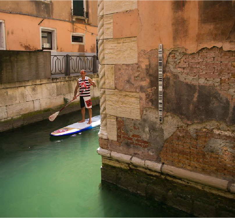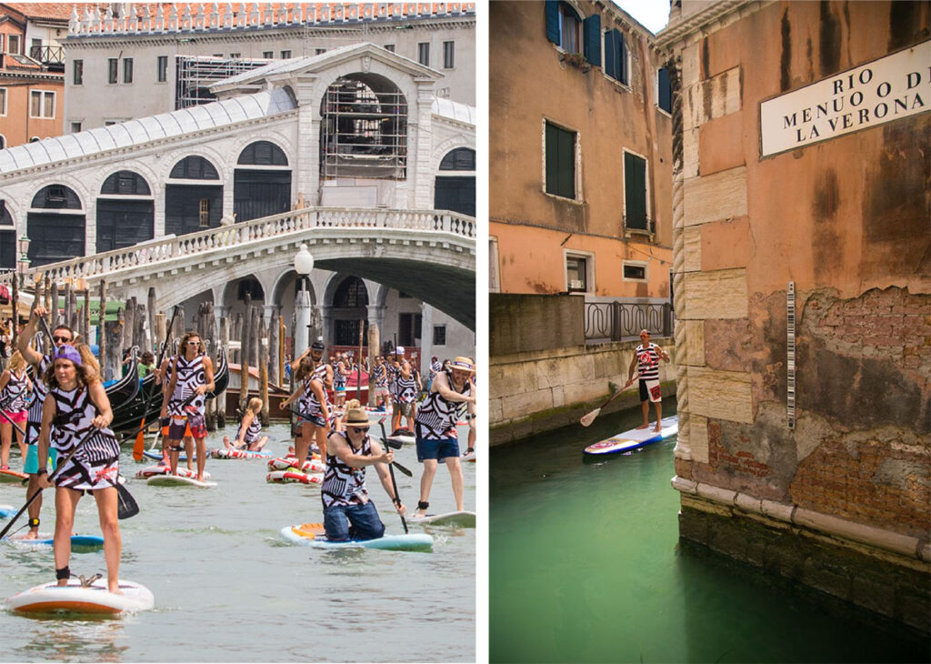 On the Grand Canal with 200 paddlers. It is the passion for paddling on a SUP board that inspires the idea of twinning Venetian rowing with Hawaiian paddling. Surfin’ Venice is born, a demonstration parade that attracts paddleboarding enthusiasts from all over the world.